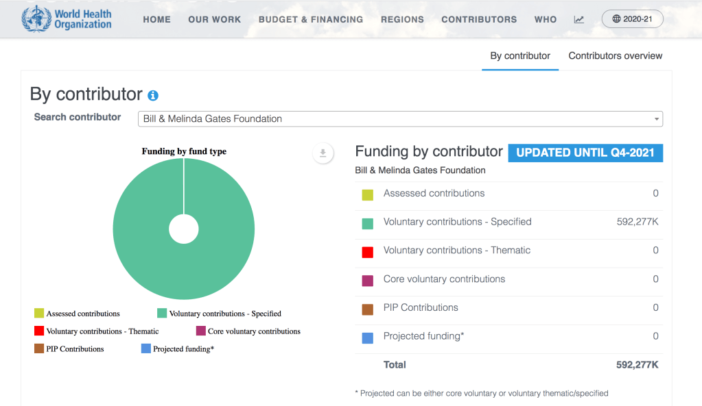 Ein Großteil der Finanzierung der WHO besteht aus freiwilligen Spenden, besonders auch Pharma-nahen Organsationen. Diese freiwilligen Spenden sind jedoch oft zu 100% „specified“, fließen also allein in vom Spender unterstützte Projekte, die in der Regel anschließend auch von öffentlichen Geldern mitfinanziert werden.
