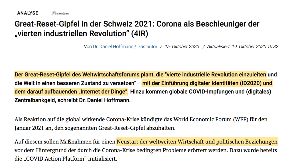 CoVID wird von WEF-Politikern weltweit als Grundlage des Great Reset und der digitalen Transfomramation/ 4. industriellen Revolution kommuniziert.