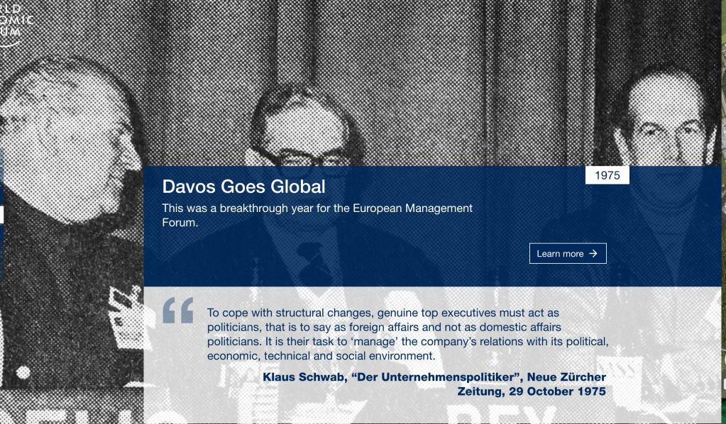 1971 von Klaus Schwab als European Management Forum gegründet, avanciert das WEF bereits 1975 zur neuen globalen Konzernrepräsentative.