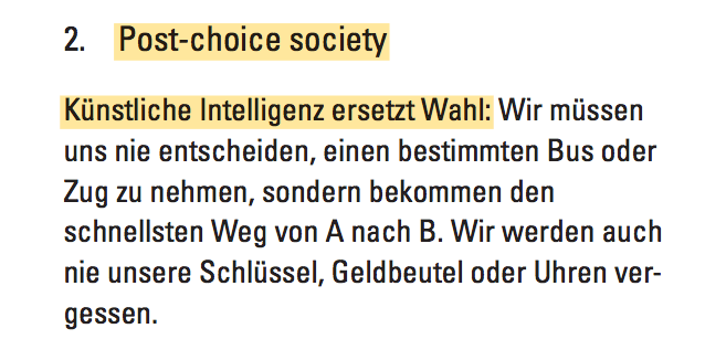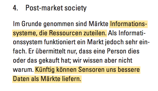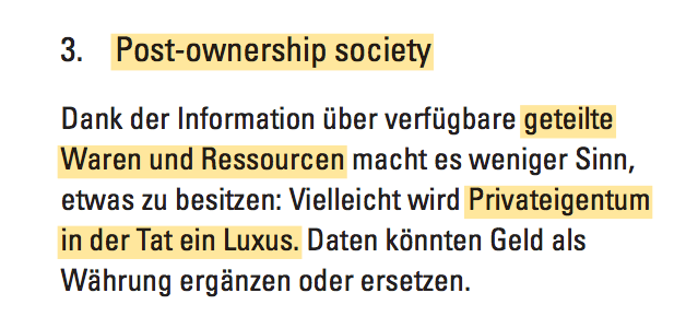 „…….Heute sind wir darum besorgt, wer unsere Daten kontrolliert. Vielmehr sollten wir uns aber darüber Gedanken machen, wer unser physisches Umfeld kontrolliert: unsere Straßen, Autos, Häuser, Türen und Schlösser. Wenn alle Internet-Suchen mit Google getätigt werden, ist das noch einigermaßen irrelevant. Aber wenn alle Autos von Uber und alle Häuser von AirBnB betrieben werden, stellt sich die Situation ganz anders dar.………..“