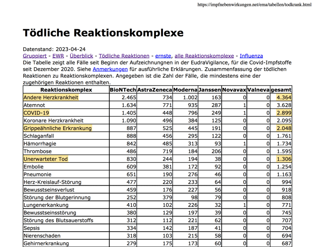 Geschädigte haben stattdessen häufig Schwierigkeiten, adäquate Hilfe zu finden, wenn sich gesundheitliche Probleme einstellen. Viele Ärzte scheinen meist keinen Zusammenhang mit den plötzlichen Leiden Ihrer Patienten und der mRNA-Behandlung herzustellen. Bei Betrachtung der rechtlichen Situation des „informed consent“ durchaus verständlich.