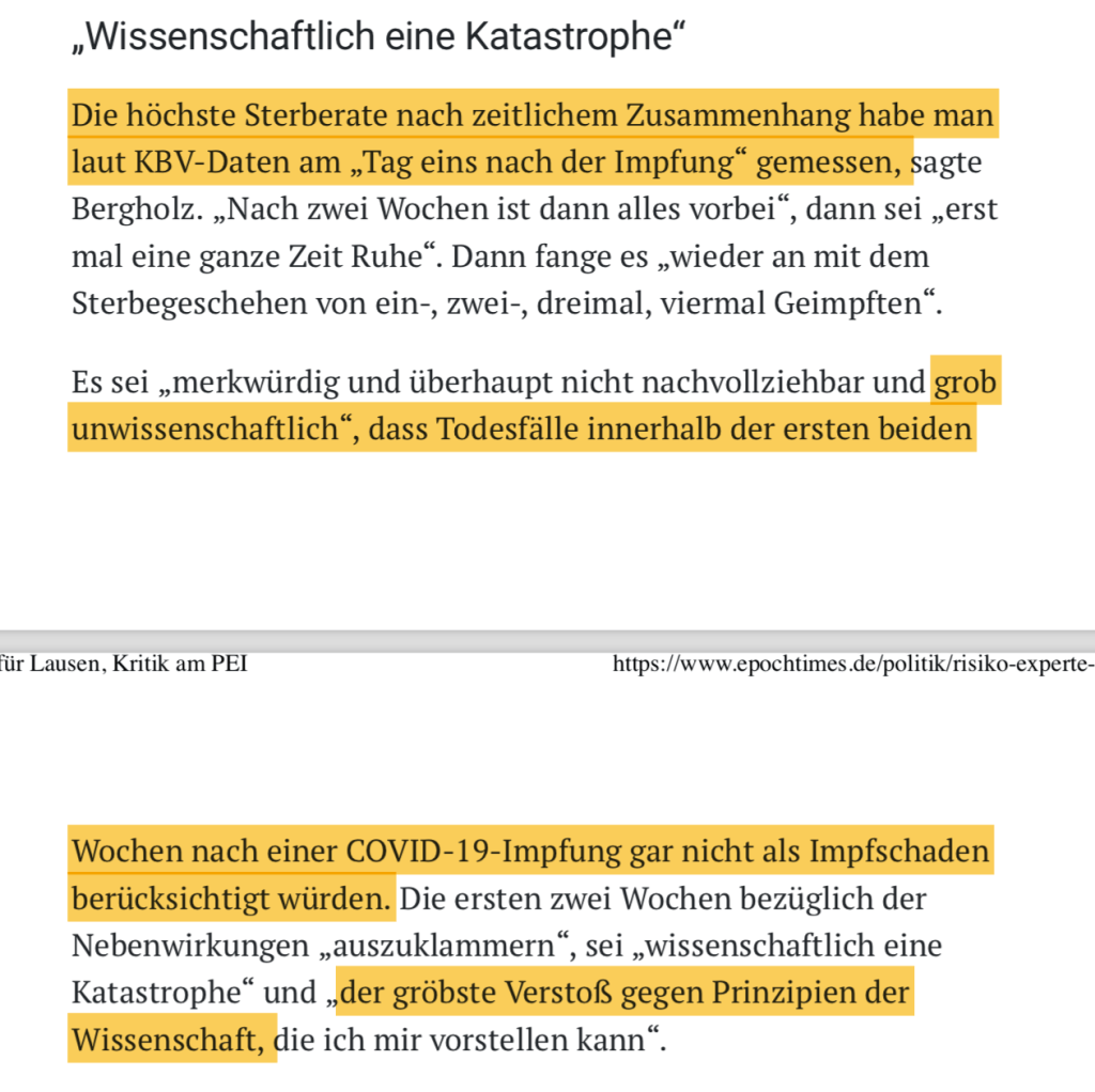 Das Problem: die Untererfassung bei der Meldung von Nebenwirkungen kann bis zu 90% betragen. Das Ausfüllen der Meldeformulare ist mit erheblichem Zeitaufwand verbunden, der nicht honoriert wird. „Impfärzte“ sind auch möglicherweise schon aufgrund der rechtlichen Lage zurückhaltend, Nebenwirkungen zu diagnostizieren. Das ganze Thema ist zum Nachteil der Geschädigten mit einem großen Tabu belegt.