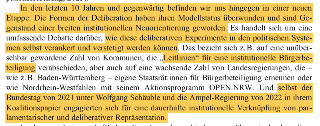 Seit den 60er Jahren wird an deliberativen Formen von Demokratie geforscht. Wir finden in der Literatur unzählige Abhandlungen. Inzwischen wird immer mehr anerkannt, daß das alte repräsentative Modell ausgedient hat, und es entstehen neue Bewegungen wie die Partei dieBasis.